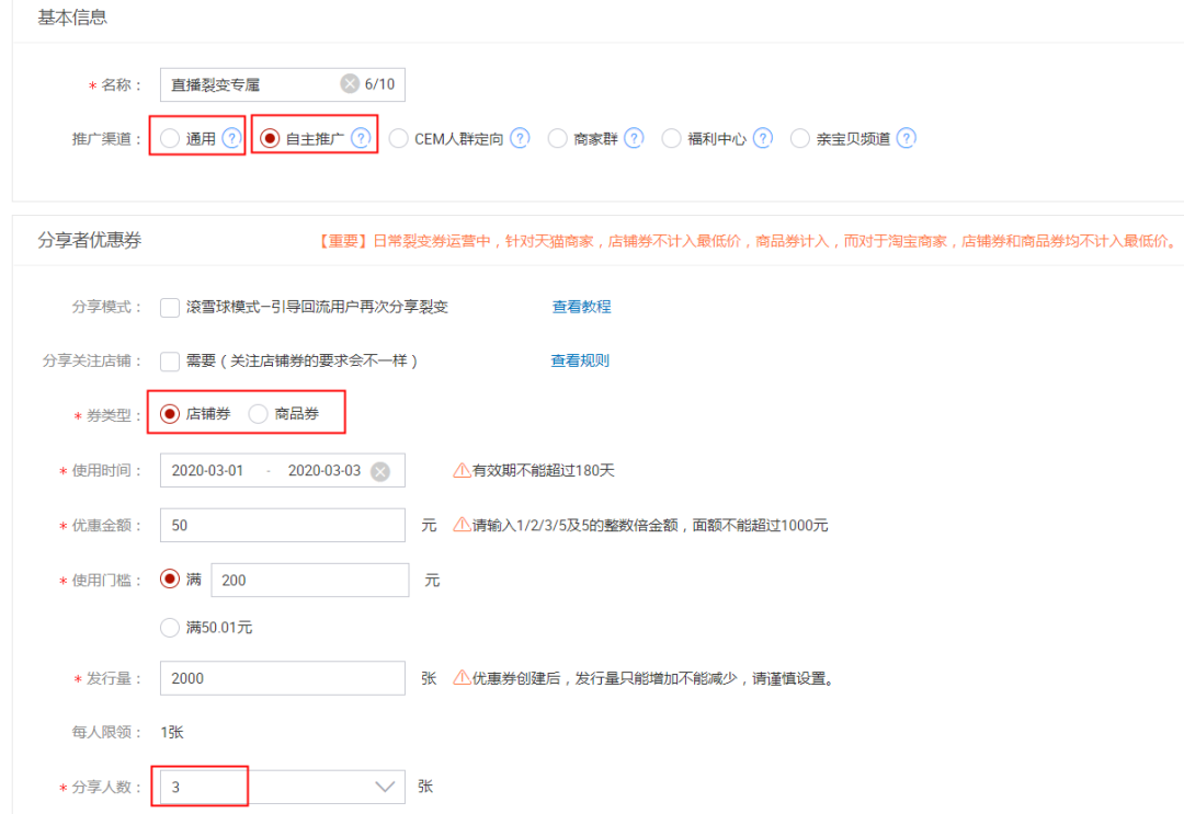 ·分享人数:3/5/10。请大家根据券的力度决定,初期使用建议较低门槛,选择分享3人
